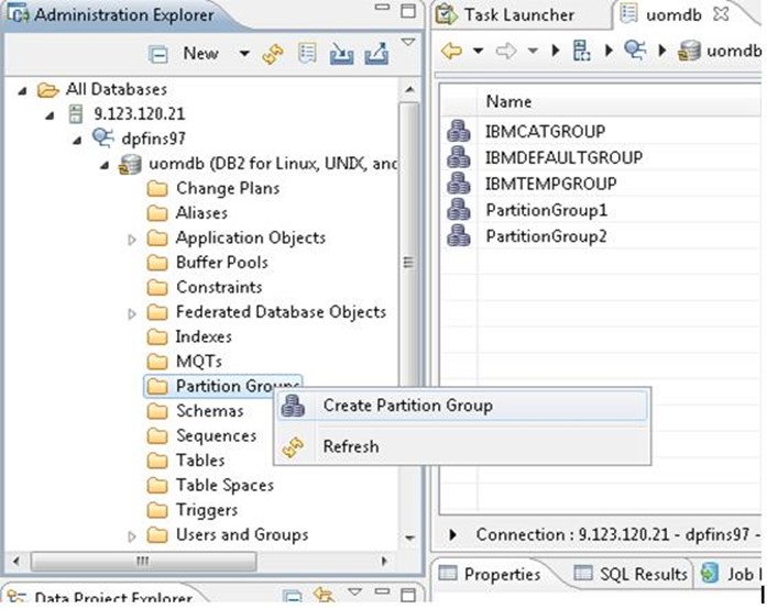 1. 在 Data Studio 中為數據庫 UOMDB 創建一個數據庫連接,在 Administrator Explorer 視圖,展開數據庫 UOMDB 節點,右鍵點擊文件夾 Partition Groups,選擇 Create Partition Group,如下圖 18: