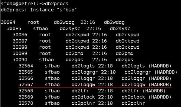 首先,我們需要找到主機上的寫日誌的 EDU(Engine Dispatchable Unit),即 db2loggw 的線程號(或進程號)。對於 v91 及以前的版本,我們使用 db2procs,如圖 8: