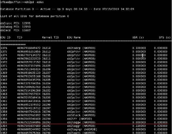 對於 v95 及以後版本,db2 基於線程模型,使用 db2pd – edus,如圖 9: