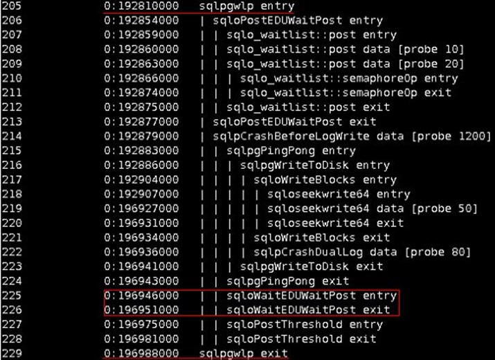 4. 計算 sqloWaitEDUWaitPost 的執行時間。T2 = 0.196951000 – 0.196946000 = 0.000005000