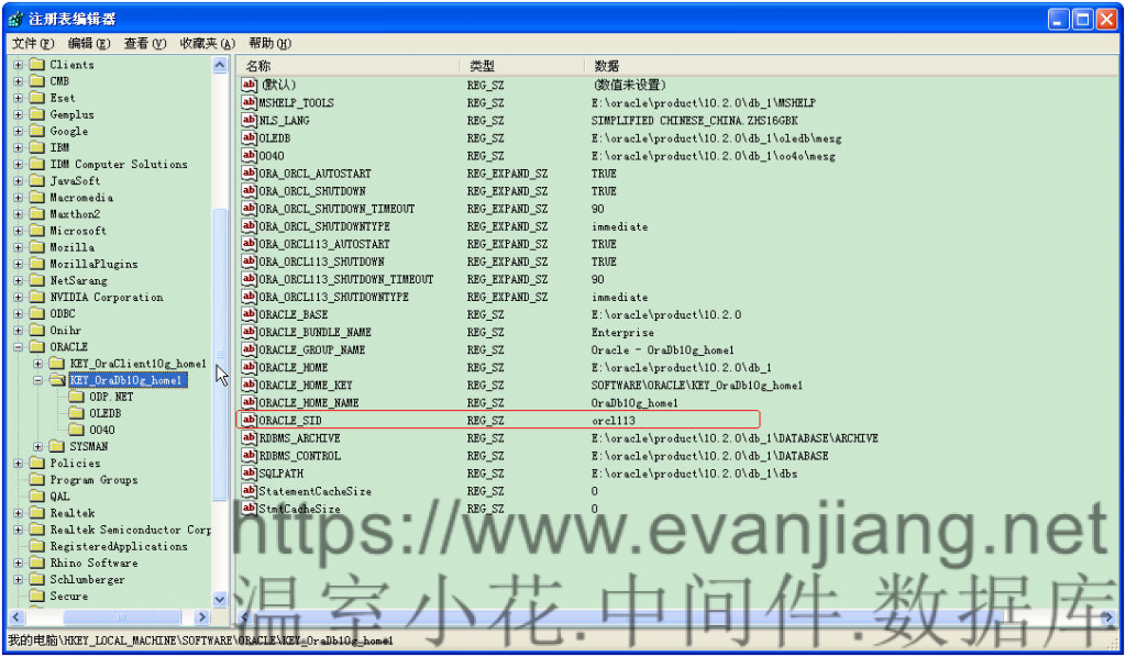 (1)开始—>运行(输入regedit),在HKEY_LOCAL_MACHINE\SOFTWARE\ORACLE\KEY_OraDb10g_home1中有ORACLE_SID的键值(系统默认值),如下图所示: