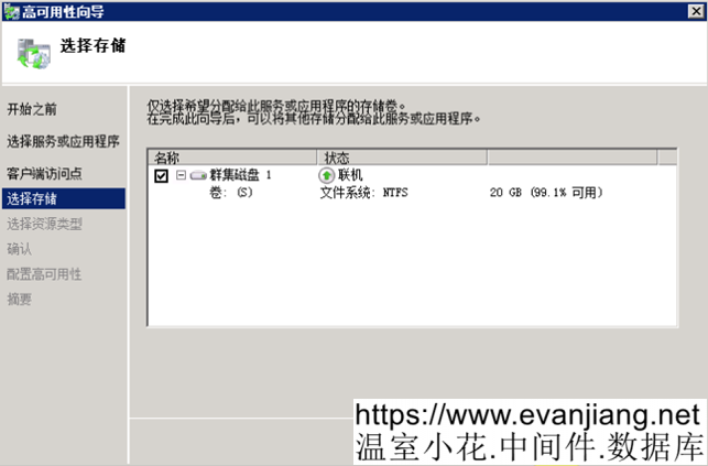 点击”下一步”,这里可以看到,群集磁盘1就是S盘,即我们的数据盘,为了便于区分,下面的步骤将会重命名这个磁盘,取名为data,