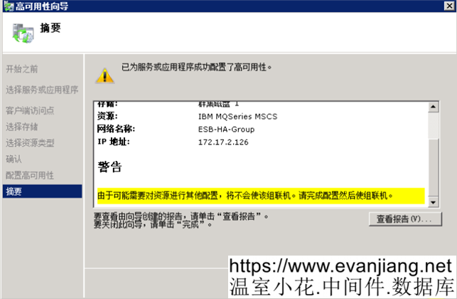 在”摘要”页,点击”完成”按钮。这里这个黄色的警告可以先忽略,后面的步骤会配置资源。