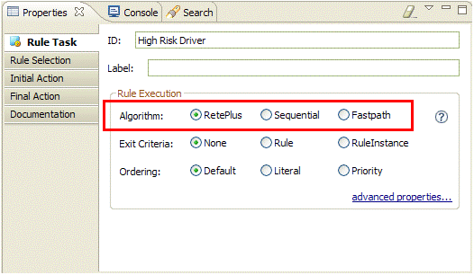 這時在規則任務的屬性窗口中,將可以看到該規則任務所使用的規則執行的算法,默認是使用 RetePlus,您可以在這裡修改為 Sequential 或者 FastPath。