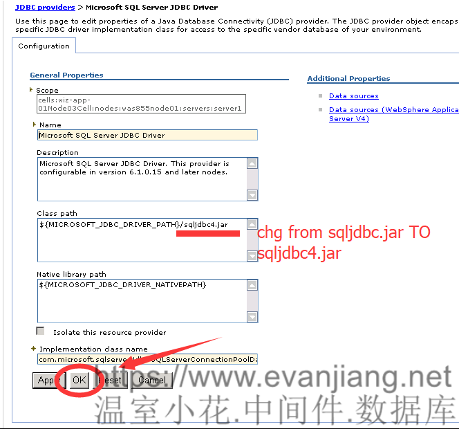 Copy SQLServer JDBC driver in WASv7 lib folder to WASv8 lib folder