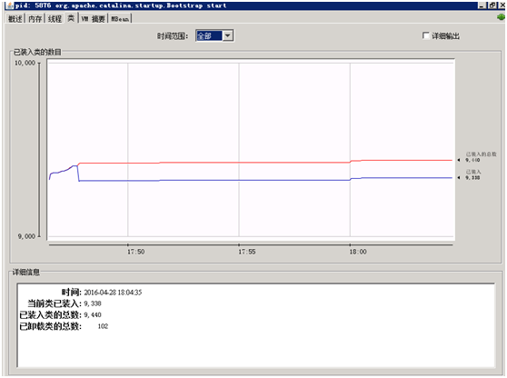 概要界面可以实时查看java应用程序的堆内存使用情况、线程、类以及CPU使用情况,如图: