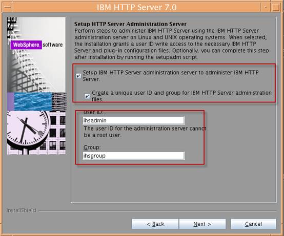 (注:在Linux/Unix环境下面可以设置一个IHS的管理服务器admin server来对IHS的启动和停止进行管理,此时如果勾选设置,需要建立一个系统的用户和组来管理IHS管理服务器的文件,如下图的ihsadmin/ihsgroup。 也可以取消勾选不设置管理服务器,则此时不能使用非受管节点的方式来在管理控制台上启停IHS,因此此方式需要调用admin server来启停)