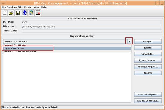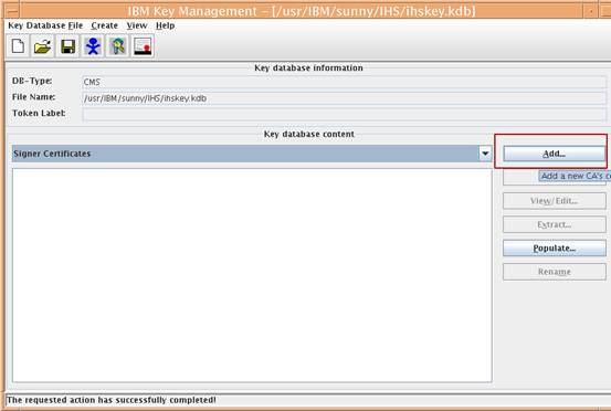 在IHS的ikeyman管理界面,選擇簽署人證書 Signer Certificates,然後點擊添加
