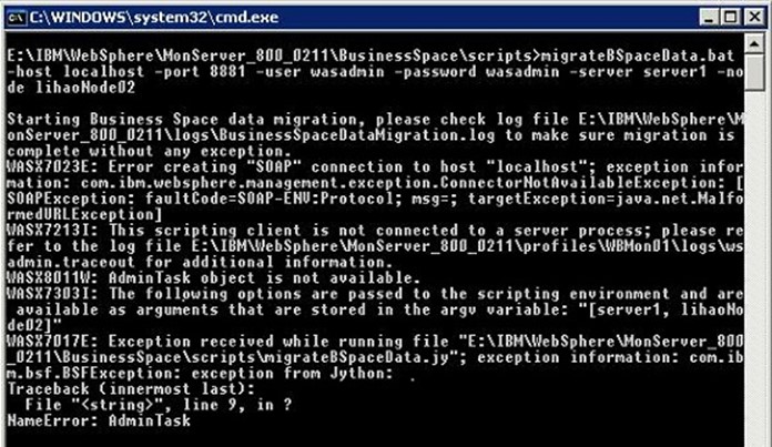 由於用戶疏忽大意,或者用戶對 Business Space 數據遷移命令的不熟悉,從而導致數據遷移命令錯誤。在這種情況下,wsadmin 不能正常觸發伺服器端的 Business Space 數據遷移程序,所以用戶這時只需要修改數據遷移命令,以後再運行就可以了;