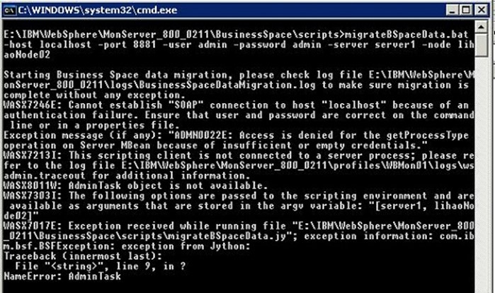 如果運行 Business Space 數據遷移命令的參數不正確,Business Space 數據遷移命令輸出信息如圖 2,在這種情況下,伺服器端的 Business Space 數據遷移程序並沒有被成功觸發,所以不需要數據回滾,修改數據遷移命令後再次運行命令即可。