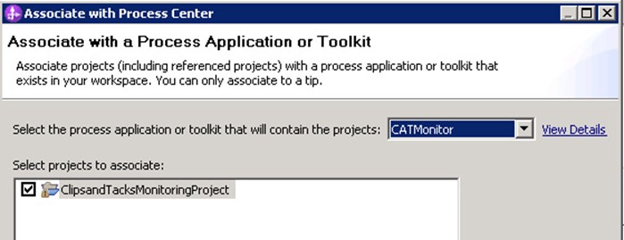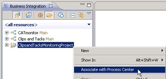 在 Business Integration 視圖中,右鍵單擊 ClipsandTacksMonitoringProject 並選擇 Associate with Process Center,如圖 42 所示。